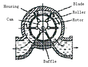 As Shown on Figure, Blades with Rotor engaged is rotating, being forced by fluid flow; during rotation, Blade is drawn-out and drawn-back one by one due to the influence of fixed Cam, which is continuously forming Measuring Chambers together with Housing Wall for fluid measuring; the Measuring Chamber Volume is a fixed one, therefore, number of Rotor turns is proportional to the fluid volume passing through the flow meter; then via attached Gear Reducer, the Fluid Volume is displayed on Counter.